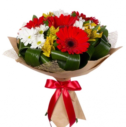 Яркий букет из гербер, альстромерий и кустовой хризантемы с добавлением зелени.